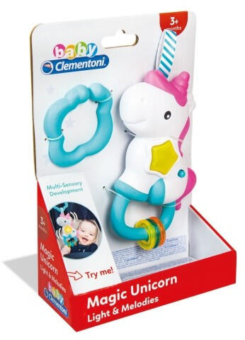 Ha egy igazán tündéri játékot szeretnénk a babának, mely garantáltan leköti majd a figyelmét, akkor keresve se találhatnánk jobbat ennél az unikornisos bébi csörgőnél, ami ráadásul még funkcióval is el van látva. Az unikornist formázó csörgő a szettben található akasztó segítségével felakasztható a babakocsira, a kiságyra vagy bárhová csak szeretnénk. A csörgőhang mellett egy gomb segítségével aktiválhatjuk a rajta a fény-és hangeffekt funkciót, hogy zenéljen és csillag világítson rajta. A csörgőn még egy forgórész is helyet kapott, melyen három színes gyűrű is található. Jellemzők: < p> -Clementoni unikornis bébi csörgő funkcióval -Hang és fényeffektek -Akasztó fül -Alsó fogó színes gyűrűkkel