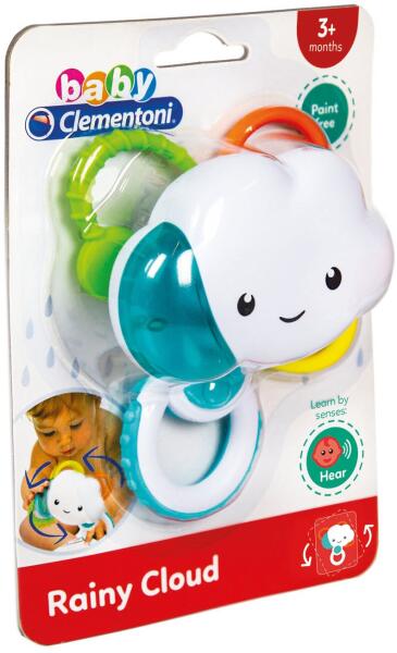 Baby Clementoni Baba csörgő - Felhőcske Felhő csörgő, amelyet kifejezetten úgy terveztek, hogy támogassa a hallás fejlődését a gyermek életének első hónapjaiban. Forgassa el a felhő elemeit, és hallgassa meg, hogyan játssza az eső hangjait. A fogantyú különböző textúrájú, domború, ami serkenti a tapintást, de a gyermekek számára is megkönnyíti a kézbe vételt.