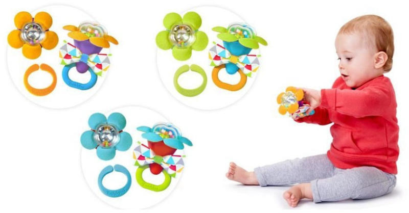 Színes, többfunkciós virág alakú csörgő. Színes gyöngyök csilingelnek és a szín átömlik a műanyag tokon. A fogantyú tökéletes a fájó íny rágásához. A termék tartalmaz egy műanyag tartót a babakocsihoz, játszószőnyeghez vagy gyermekágyhoz való könnyű rögzítéshez. 0-12m korosztály számára alkalmas